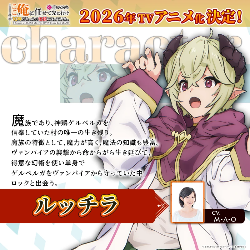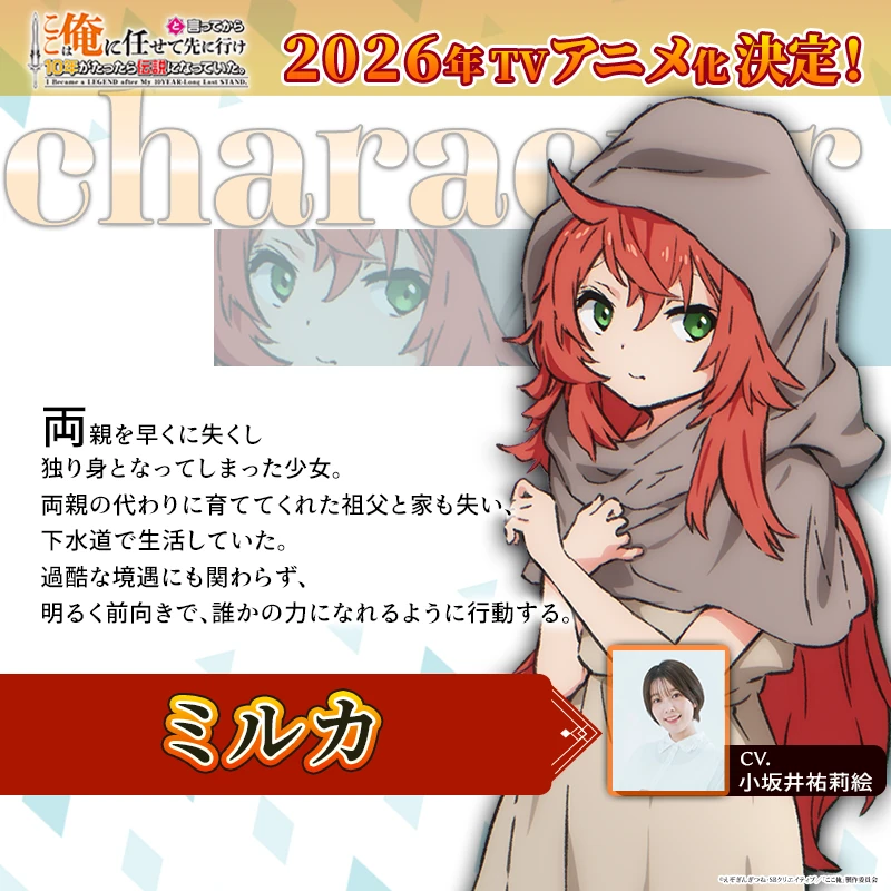 애니메이션 「여기는 내게 맡기고 먼저 가라고 말한 지 10년이 지났더니 전설이 되어 있었다.」 티저 PV, 추가 캐스트 공개 By 관리자2 2026년 01월 05일 17:43 티저 PV 루칠라 CV. M.A.O 미르카 CV. 코자카이 유리에 원작 : 에조긴기츠네캐릭터 원안 : DeeCHA애니메이션 제작 : 겟코감독 : 칸베 히로유키시리즈 구성 : 히로타 미츠타카캐릭터 디자인, 총 작화감독 : 마지로방영 시기 : 2026년 4월 ▶ 공식트위터 ▶ 공식사이트 Tags여기는 내게 맡기고 먼저 가라고 말한 지 10년이 지났더니 전설이 되어 있었다. 관련 정보 26.01.15 최신 애니메이션 정보 애니메이션 2026년 01월 15일 23:35 극장판 「러브 라이브! 니지가사키 학원 스쿨 아이돌 동호회 완결편 최종장」 개봉 시기, 티저 비주얼 공개 애니메이션 2026년 01월 15일 22:32 웹툰 「마물을 먹는 모험가 ~나만 마물을 먹고 강해진다~」 TV 애니메이션화 결정 애니메이션 2026년 01월 15일 21:58 「【최애의 아이】」 Music History: Looking back PV 공개 애니메이션 2026년 01월 13일 11:38 「장송의 프리렌」 2기 본 PV, 추가 캐스트, 오프닝 공개 애니메이션 2026년 01월 13일 11:27 「해골기사님은 지금 이세계 모험 중 Ⅱ」 티저 PV, 신 비주얼 공개 애니메이션 2026년 01월 13일 11:21 25.12.17 최신 애니메이션 정보 애니메이션 2025년 12월 18일 14:47 25.10.06 최신 애니메이션 정보 애니메이션 2025년 10월 07일 17:51 댓글 쓰기 대댓글 취소 첫 댓글 작성시 관리자의 승인이 필요하며 부적절한 내용이나 심한 욕설 등 부적절한 댓글은 삭제처리될수있습니다. Please enter your comment! 닉네임 Please enter your name here Email: You have entered an incorrect email address! Please enter your email address here Website: 닉네임이 다음번에도 저
