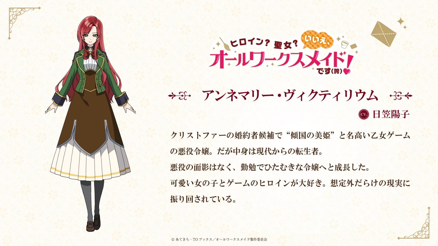 애니메이션 「히로인? 성녀? 아니요, 올 워크스 메이드 입니다! (자랑)」 티저 PV, 추가 캐스트 공개 By 관리자2 2026년 03월 30일 18:33 티저 PV 안네마리 빅티리움 CV. 히카사 요코 원작 : 아테키치원작 일러스트 : 유키코만화 : 호타루코애니메이션 제작 : EMT 스퀘어드총감독 : 이시하라 신지감독 : 무라카와 나오야시리즈 구성 : 네모토 토시조캐릭터 디자인 : 토쿠가와 에리서브 캐릭터 디자인 : 코지마 에리방영 시기 : 2026년 7월 ▶ 공식트위터 ▶ 공식사이트 Tags히로인? 성녀? 아니요, 올 워크스 메이드 입니다! (자랑) 관련 정보 26.04.04 최신 애니메이션 정보 애니메이션 2026년 04월 05일 21:51 「쓰레기 용사」메인 PV 제3탄, 메인 비주얼 제2탄, 추가 캐스트 등 공개 애니메이션 2026년 04월 05일 17:09 「일본삼국」 예고 영상 제3탄, 스페셜 비주얼, 추가 캐스트, 엔딩 공개 애니메이션 2026년 04월 02일 10:52 극장판 「러브 라이브! 하스노소라 여학원 스쿨 아이돌 클럽 Bloom Garden Party」 음악 예고 영상 공개 애니메이션 2026년 04월 02일 10:43 「사랑해 게임을 끝내고 싶어」 본 PV 공개 애니메이션 2026년 04월 02일 10:31 「니디 걸 오버도즈」SECRET.PV, 본 비주얼 공개 애니메이션 2026년 04월 02일 10:25 댓글 쓰기 대댓글 취소 첫 댓글 작성시 관리자의 승인이 필요하며 부적절한 내용이나 심한 욕설 등 부적절한 댓글은 삭제처리될수있습니다. Please enter your comment! 닉네임 Please enter your name here Email: You have entered an incorrect email address! Please enter your email address here Website: 닉네임이 다음번에도 저