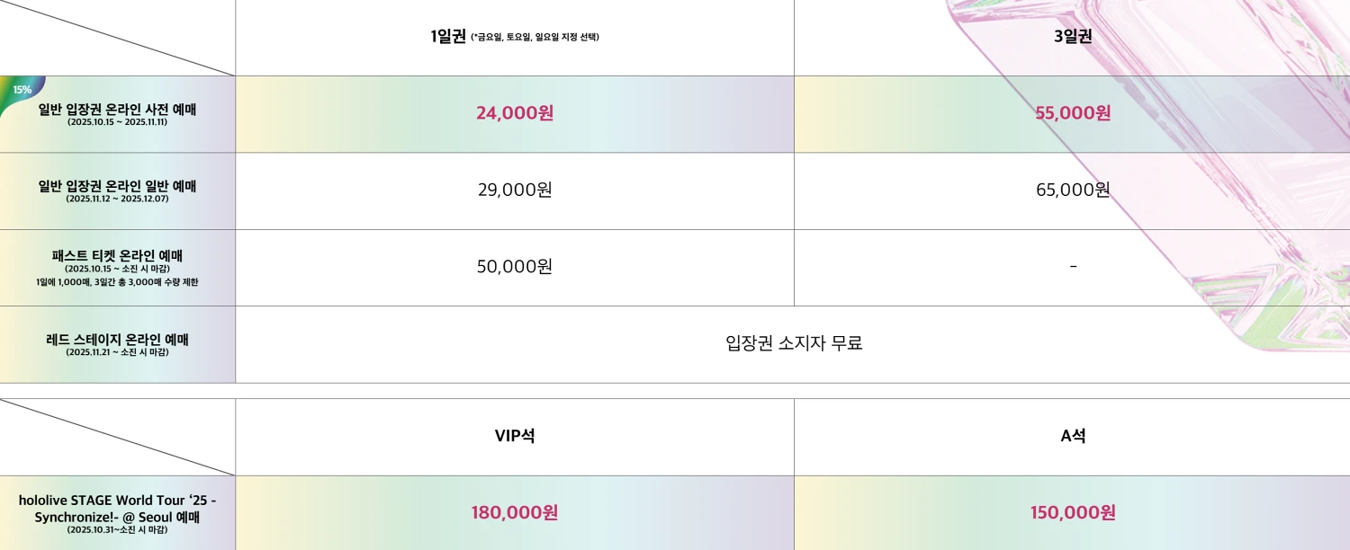 특히 이번 행사에는 일본의 인기 버추얼 유튜버 그룹 ‘홀로라이브’의 내한 공연인 ‘hololive STAGE World Tour ‘25 -Synchronize!- @ Seoul’의 예매도 함께 진행중이며 해당 공연 티켓은 A석 150,000원, VIP석 180,000원에 예매할 수 있습니다.