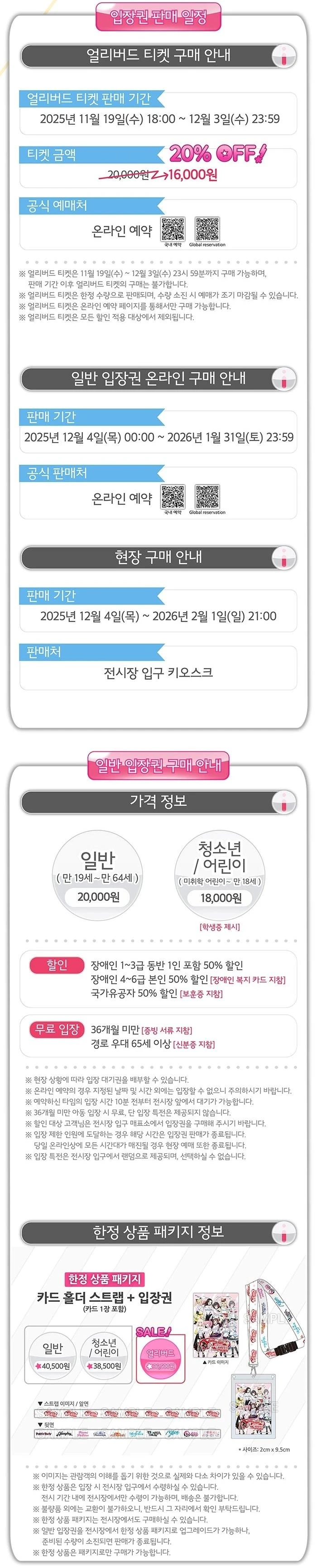 전시회 개막을 앞두고 오는 12월 3일까지 얼리버드 티켓 판매가 진행됩니다. 이 기간 동안 예매할 경우 정가 대비 20% 할인된 가격으로 구매할 수 있으며, 일반 예매 가격은 ▲성인 20,000원, ▲청소년 및 어린이는 18,000원으로 책정되었습니다. 이와 더불어 소장 가치를 높인 ‘한정 상품 패키지’도 판매되며, 해당 패키지에는 카드 홀더 스트랩이 포함되어있습니다. 가격은 ▲성인 40,500원, ▲청소년 및 어린이 38,500원으로 책정되었습니다.