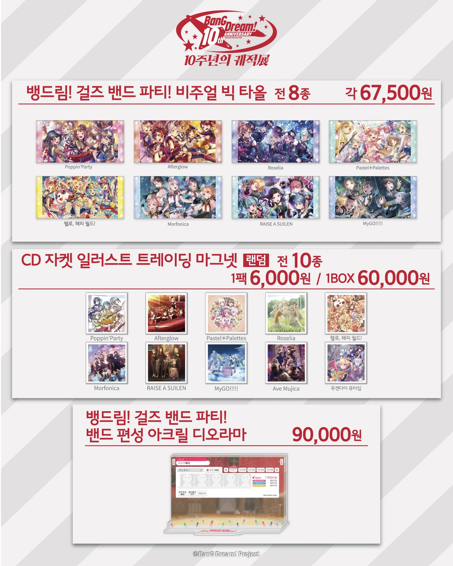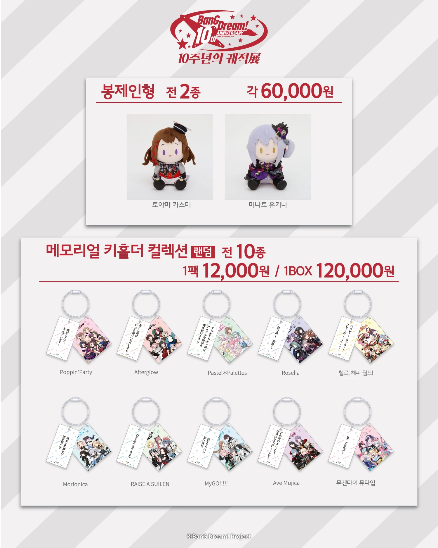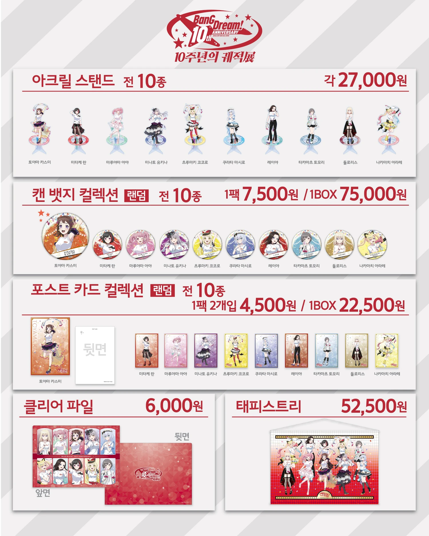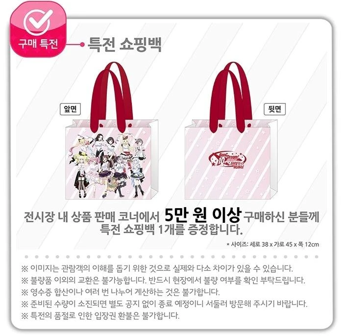 이번 뱅드림 10주년 전시회장에서만 구매할 수 있는 공식 굿즈 라인업도 함께 공개되었습니다. 10주년을 기념해 제작된 오리지널 굿즈들과 한국 개최 기념을 제작된 굿즈들을 만나 볼 수 있습니다. 또한 현장에서 5만 원 이상 굿즈를 구매할사 특전 쇼핑백을 증정하는 이벤트도 함께 진행됩니다.