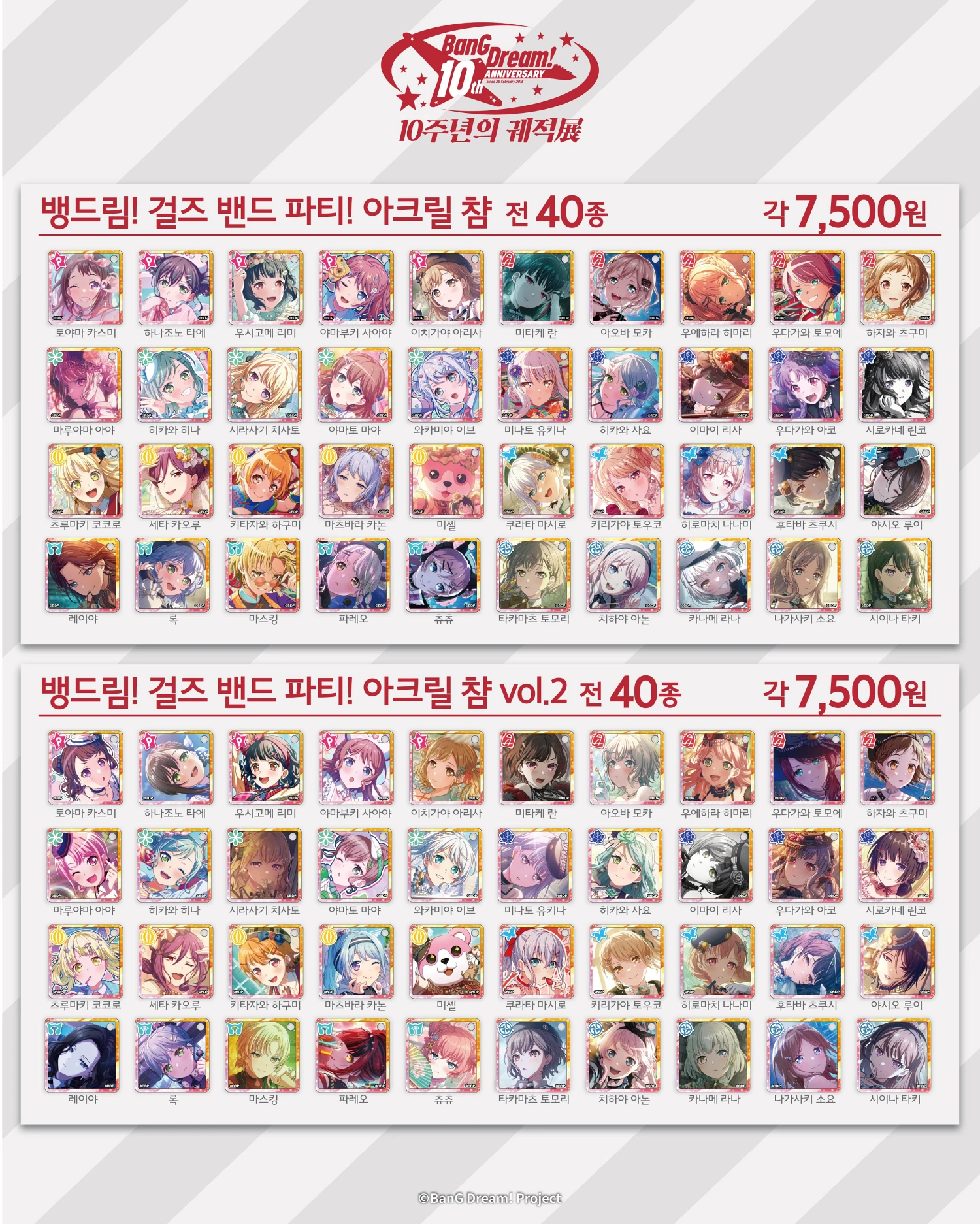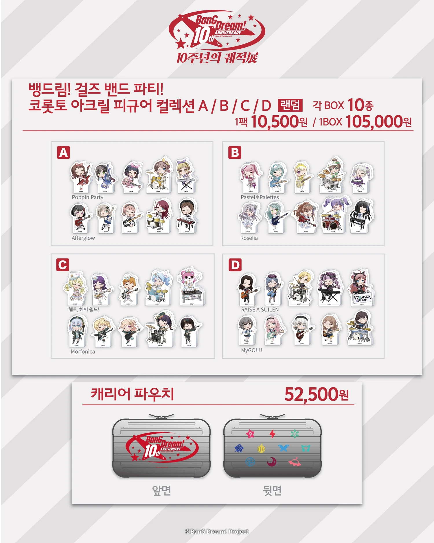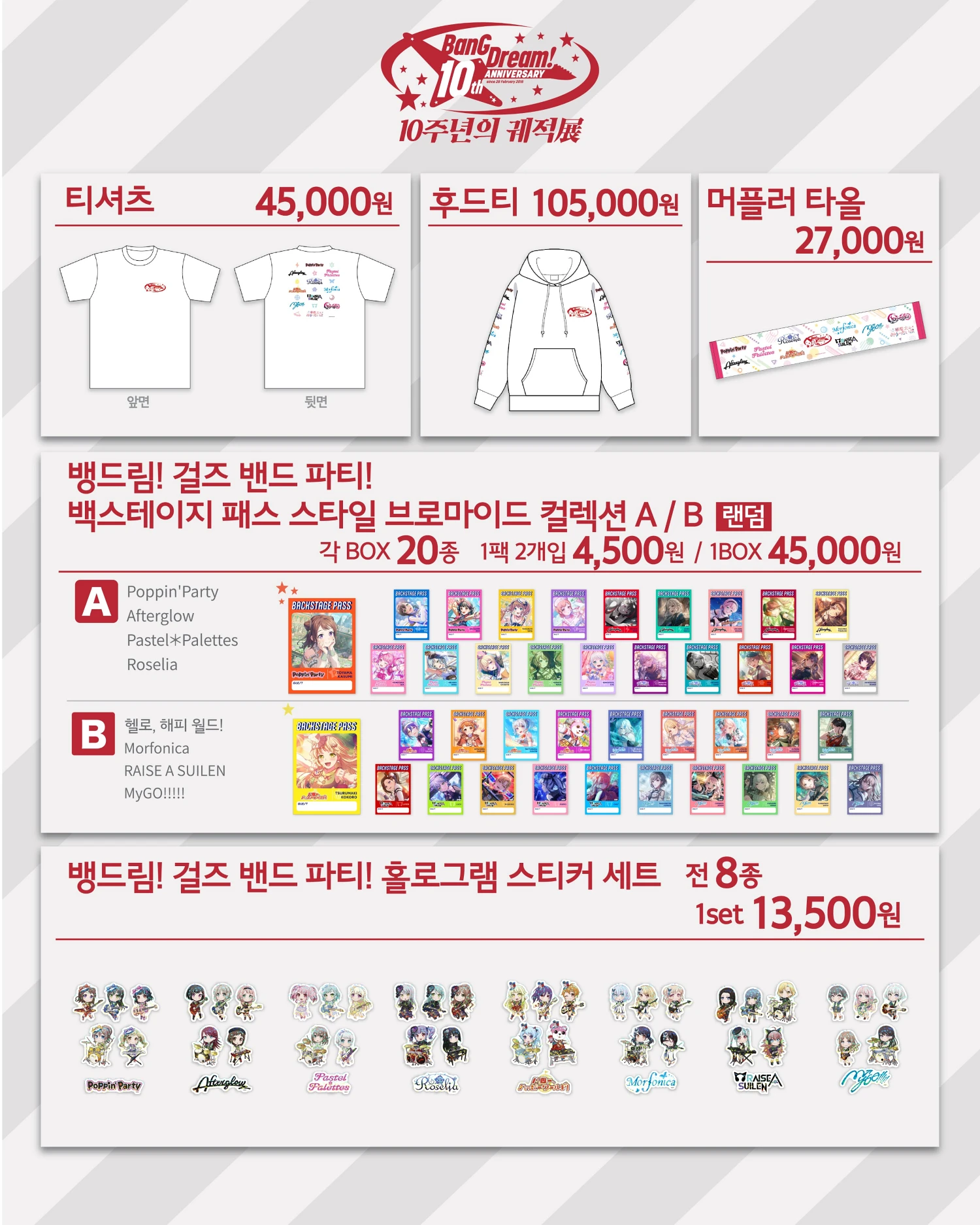 이번 뱅드림 10주년 전시회장에서만 구매할 수 있는 공식 굿즈 라인업도 함께 공개되었습니다. 10주년을 기념해 제작된 오리지널 굿즈들과 한국 개최 기념을 제작된 굿즈들을 만나 볼 수 있습니다. 또한 현장에서 5만 원 이상 굿즈를 구매할사 특전 쇼핑백을 증정하는 이벤트도 함께 진행됩니다.