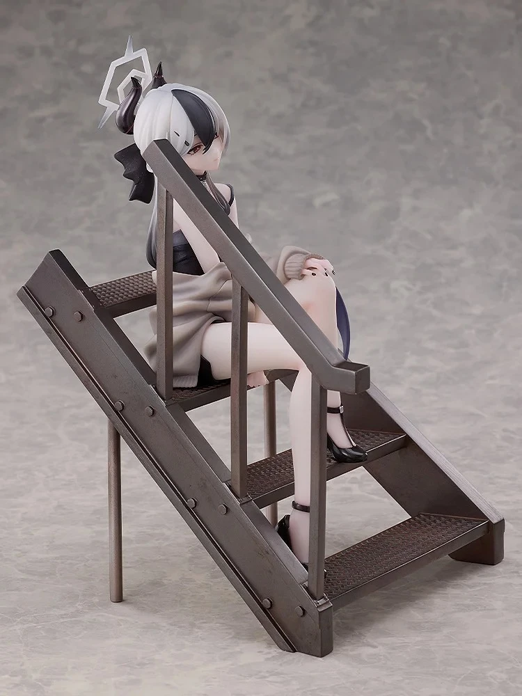 계단에 걸터앉아, 무릎에 손을 얹은 편안한 포즈. 벗다 만 가디건이 부드럽게 펼쳐지고, 특징적인 한쪽 날개에는 옅은 보라색 채색이 입혀져 있습니다. 가늘게 뜬 눈동자로 이쪽을 바라보는 표정은, 마치 고양이처럼 변덕스러우면서도, 어딘가 응석 부리는 듯한 분위기도 느껴집니다.