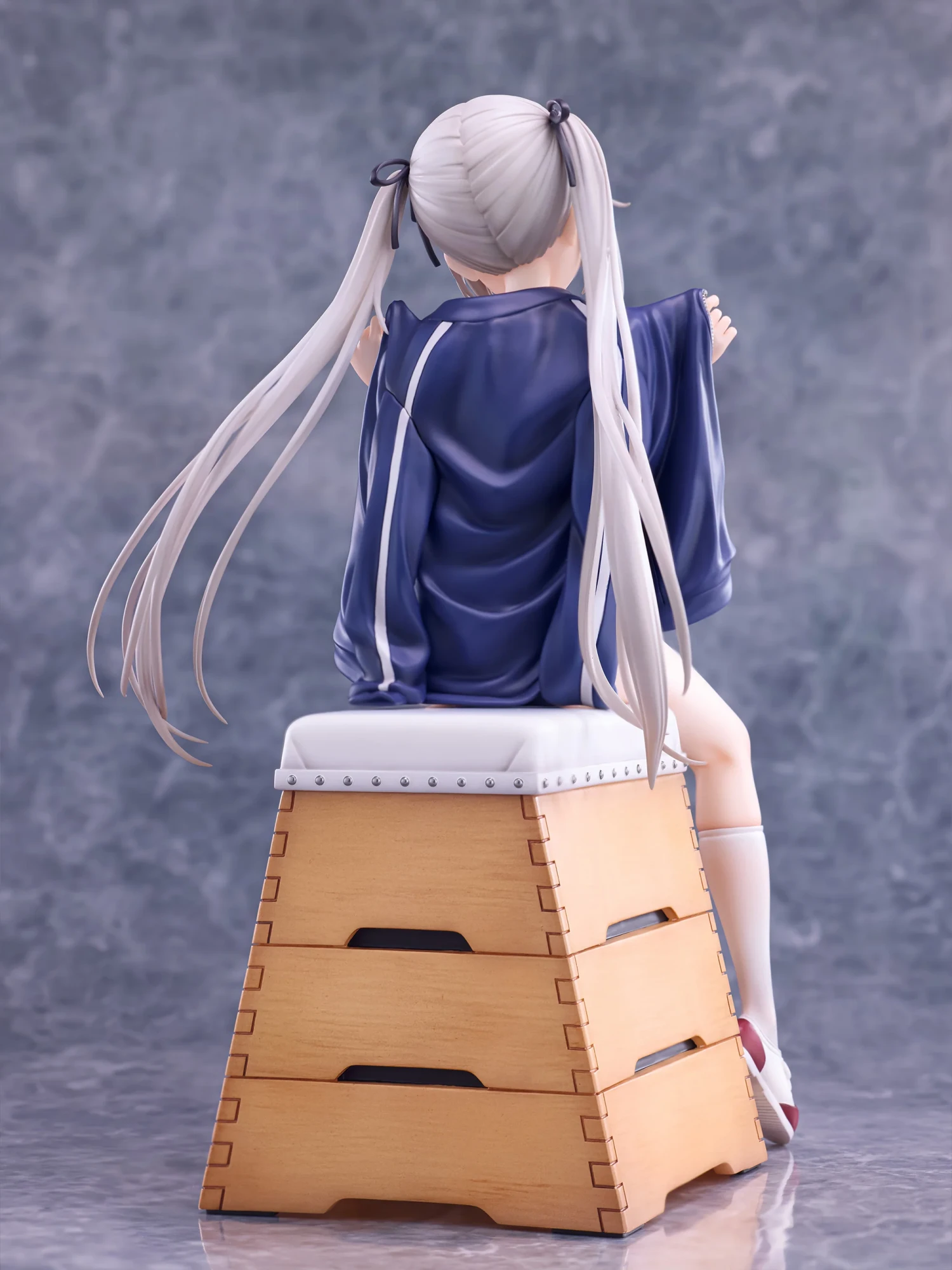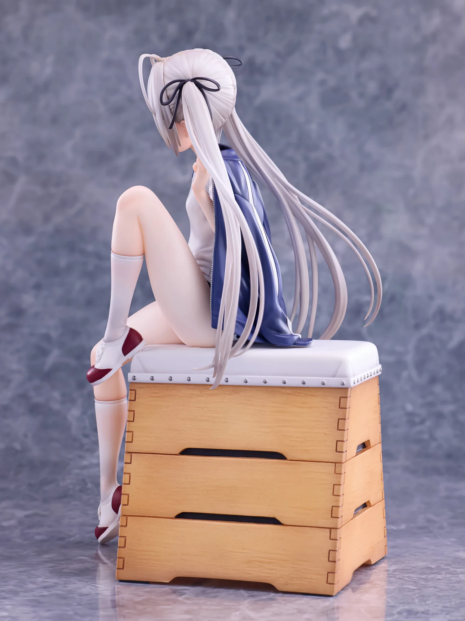 뜀틀 위에 앉아 한쪽 다리를 올린 포즈는, 가련함과 대담한 분위기를 겸비한 완성도. 하얗게 비치는 듯한 피부가 소라의 덧없는 아름다움을 돋보이게 합니다. 의상은 체육복에 부르마라는 왕도 스타일. 세부까지 정성스럽게 만들어진 디테일은 필견입니다.