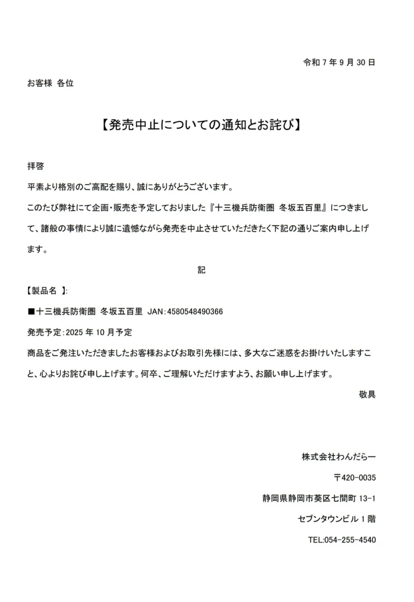 [원더러] 「13기병방위권」 ‘후유사카 이오리’ 1/7 스케일 피규어 발매 취소