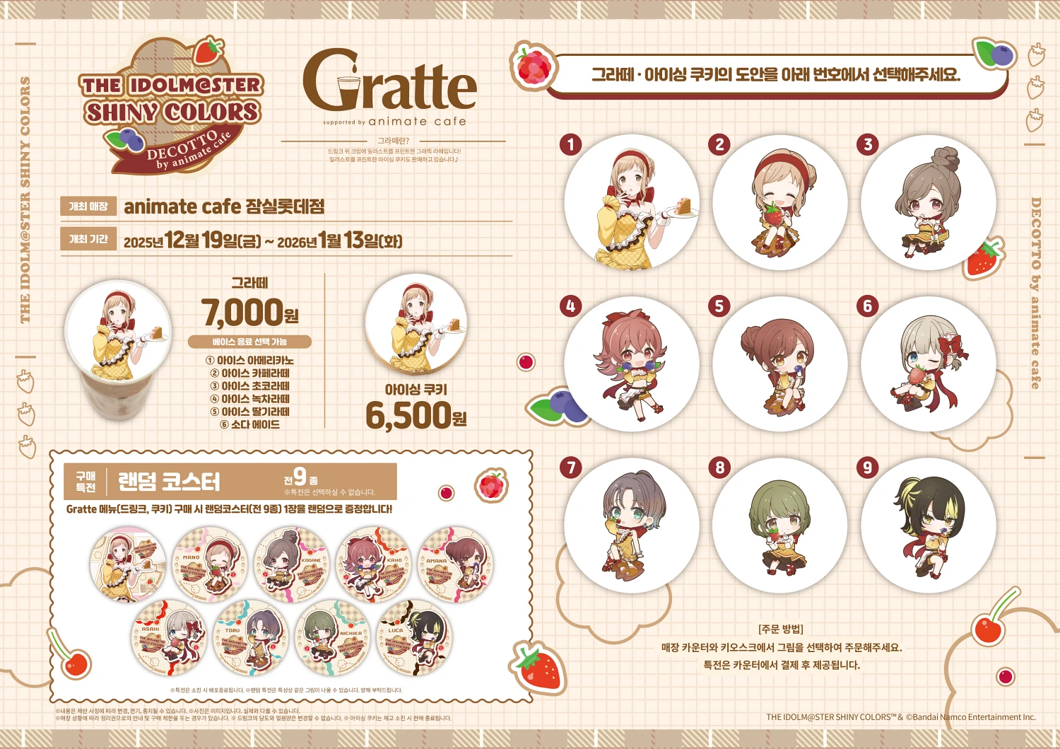또한, 샤이니 컬러즈 등장 캐릭터들의 개성을 살린 카페 메뉴와 캐릭터 프린팅 음료인 Gratte(그라떼)등 샤이니 컬러즈 팬들이 즐길 수 있는 다양한 요소들이 마련되어있다.
