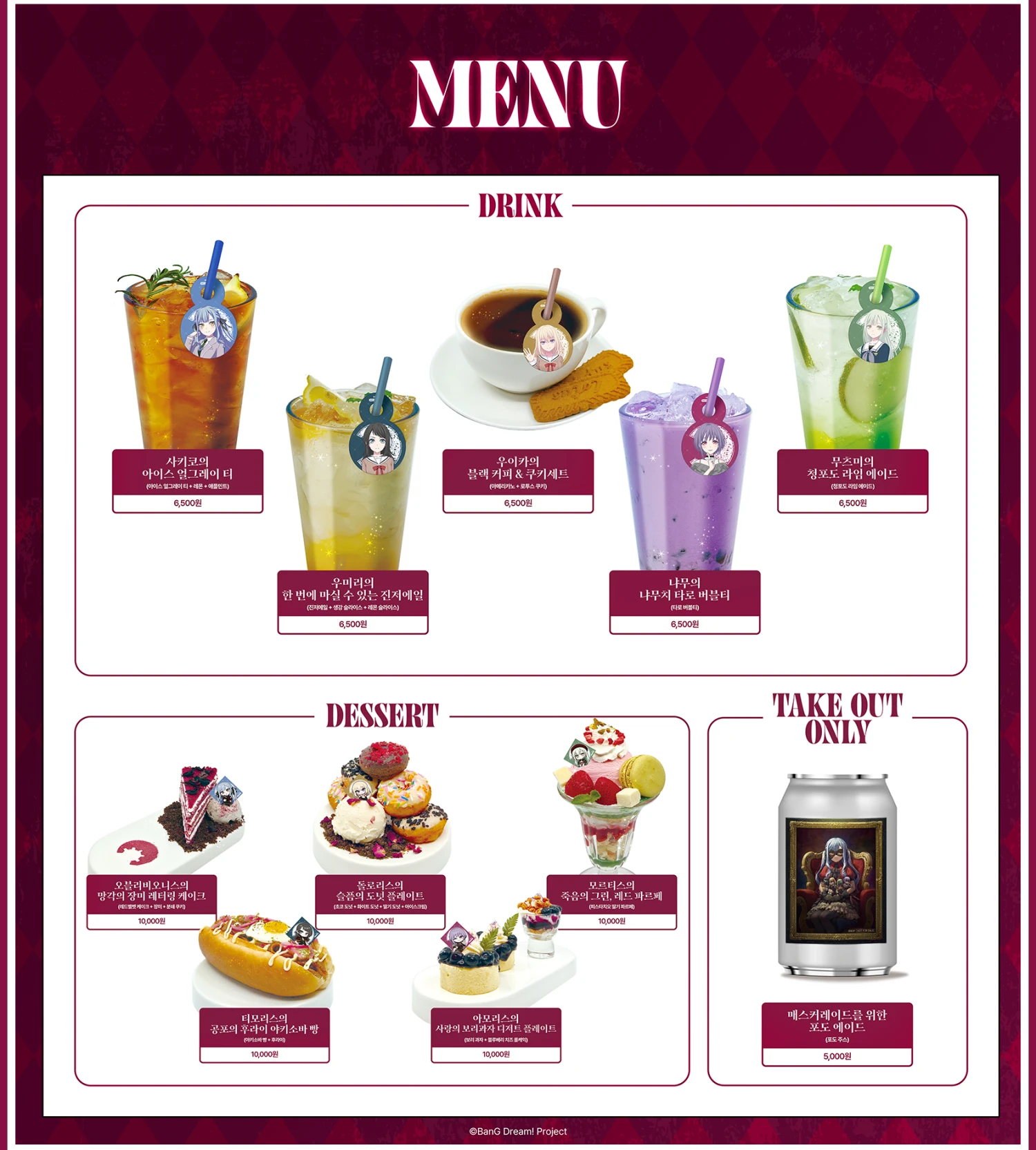 이번 콜라보 카페는 Ave Mujica 다섯 멤버(사키코, 무츠미, 우이카, 우미리, 냐무)의 고유한 서사와 비주얼을 반영한 다채로운 메뉴들로 채워질 예정이다. 각 멤버의 이미지를 형상화한 시그니처 음료와 디저트는 물론, 매일 정해진 수량만 판매되어 소장 가치를 더하고 특별한 굿즈를 증정하는 한정 수량 메뉴가 방문 욕구를 자극한다.