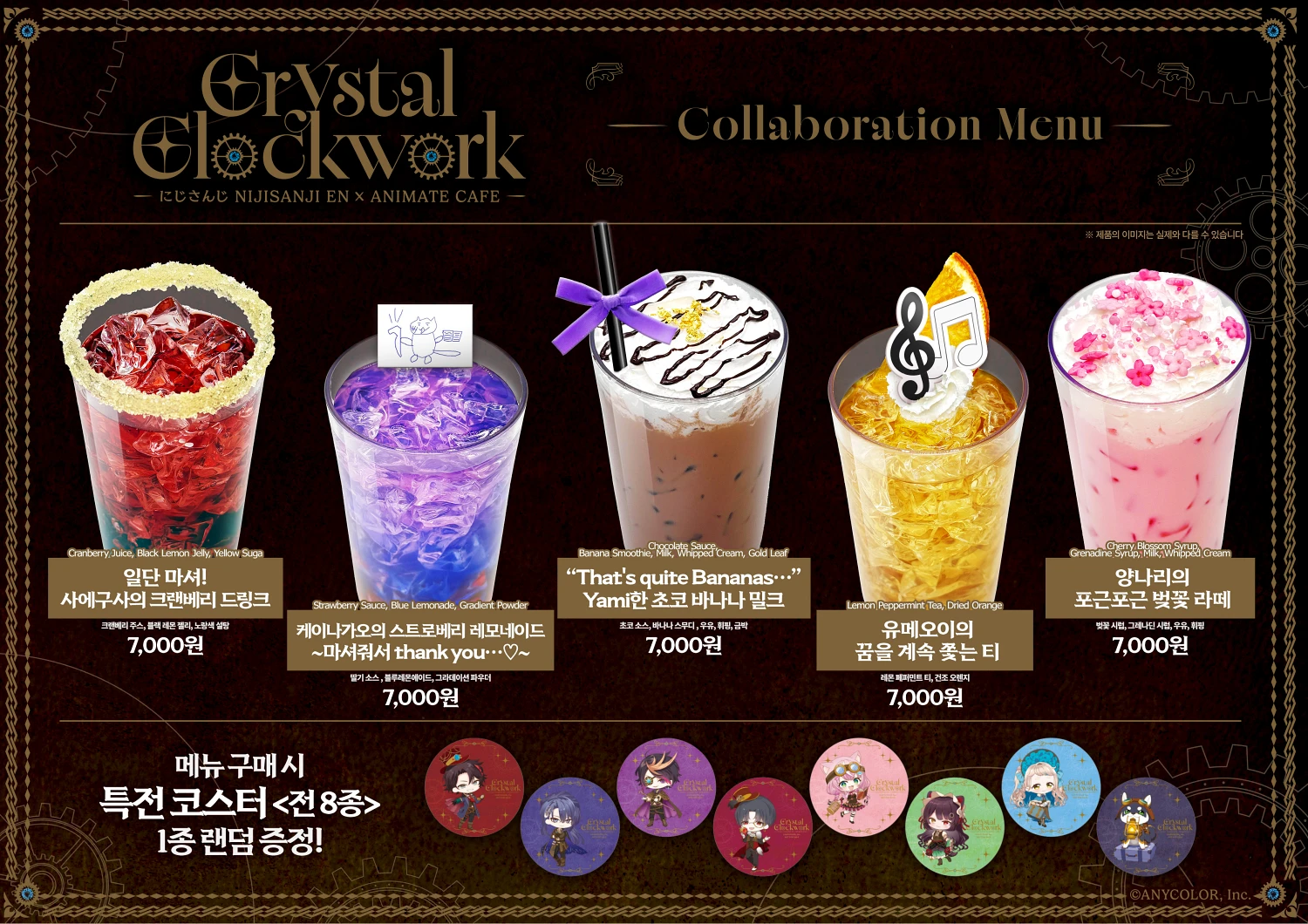 현장에서는 각 라이버의 특색을 살린 콜라보 음료와 디저트 메뉴를 비롯해, ‘Crystal Clockwork’ 컨셉의 신규 일러스트를 활용한 한정 굿즈를 만나볼 수 있다.