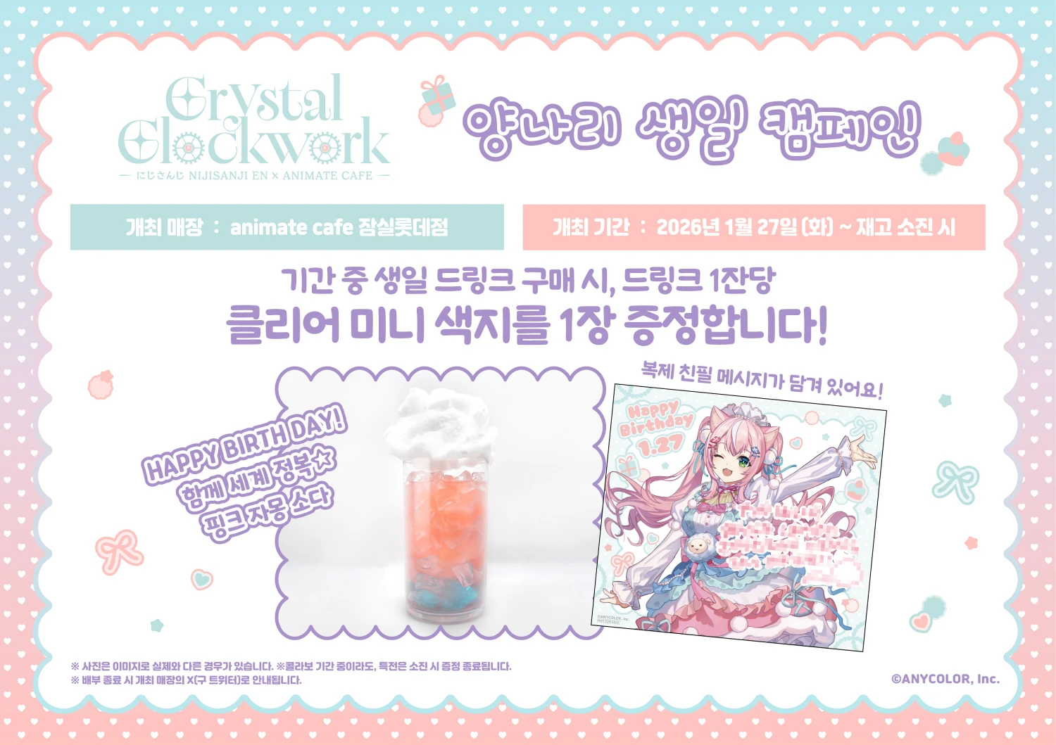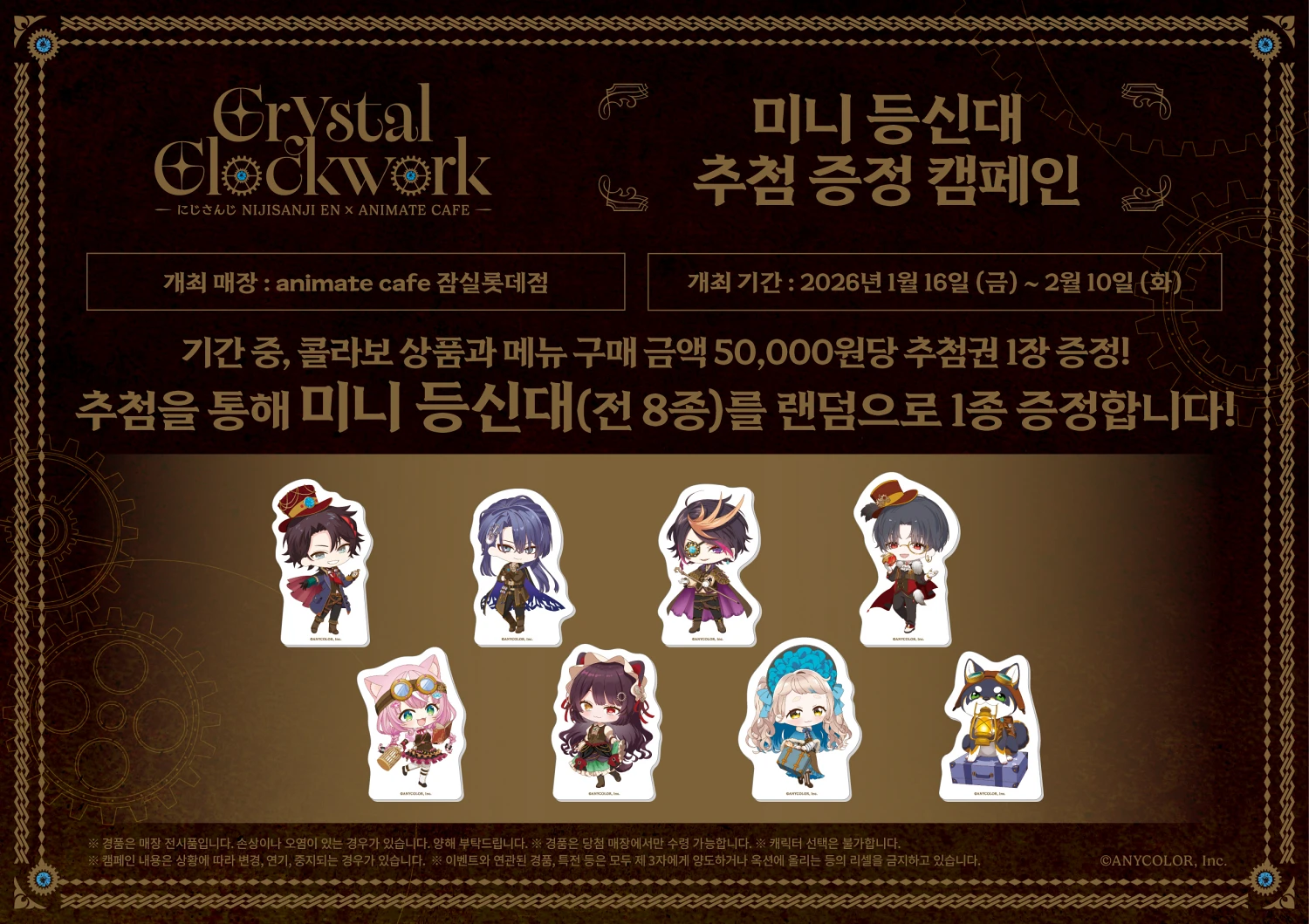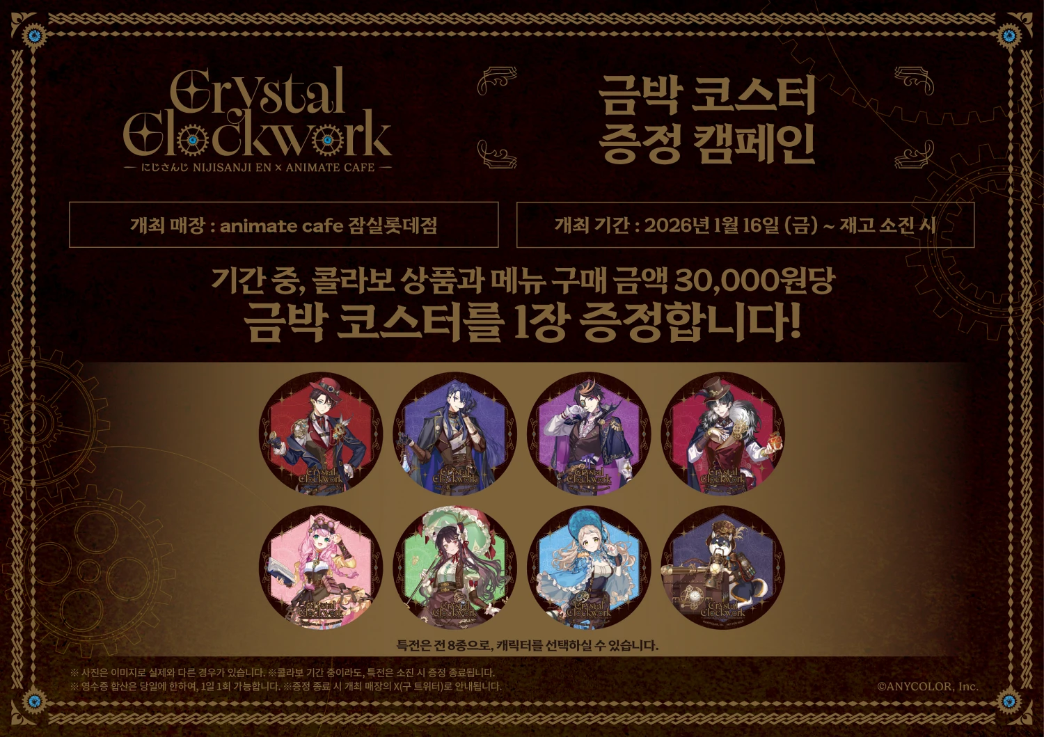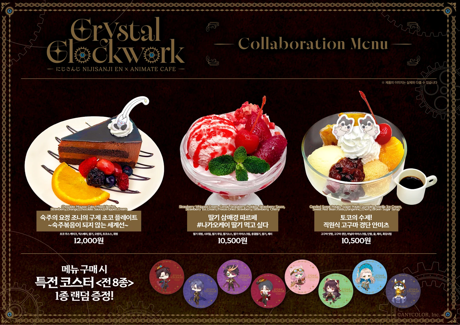 애니메이트 카페는 오는 2026년 1월 16일부터 2월 10일까지 애니메이트 카페 잠실 롯데점에서 ‘Crystal Clockwork’를 테마로 한 니지산지 콜라보레이션 카페를 운영한다고 밝혔다.