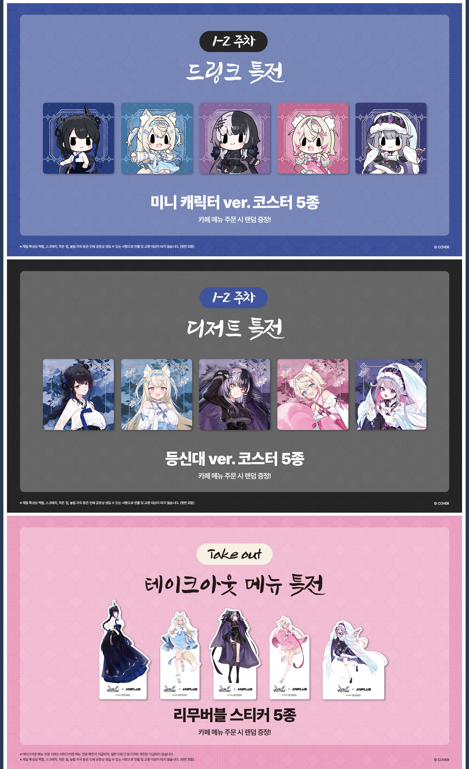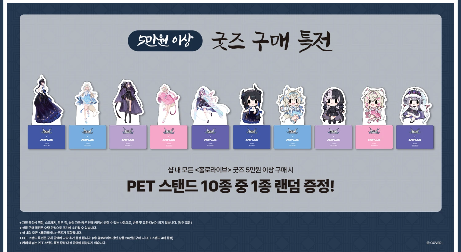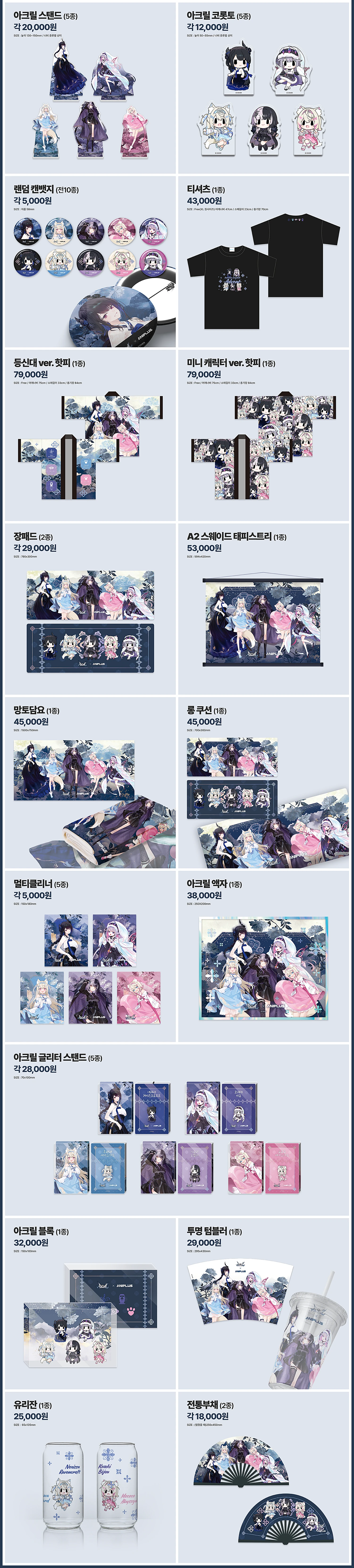 이번 콜라보의 핵심은 단연 한국 팬들을 위해 새롭게 그려진 단독 일러스트이며, 시오리 노벨라 / 코세키 비쥬 / 네리사 레이븐크로프트, 그리고 후와와&모코코 어비스가드 자매가 각자의 상징색이 돋보이는 개량 한복을 입은 모습으로 등장하여 팬들의 시선을 사로잡았다. 특히 이 일러스트를 활용한 아크릴 스탠드(20,000원), 장패드(29,000원), 그리고 한국적인 미를 극대화한 전통부채(18,000원), 핫피 등은 이번 콜라보에서만 만날 수 있는 핵심 굿즈로 꼽힌다.