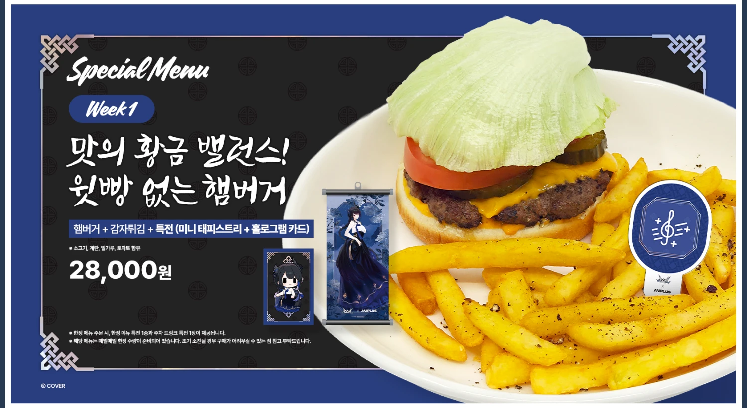 식음료 메뉴 또한 멤버들의 개성이 넘친다. 고증을 살린 시오리 노벨라의 1주차 특별 메뉴 맛의 황금 밸런스! 윗빵 없는 햄버거(28,000원)는 주문 시 미니 태피스트리와 홀로그램 카드가 함께 증정된다. 이외에도 네리사의 오미자 에이드, 후와와의 말차 라떼, 모코코의 너겟 밀크티 등 각 멤버의 특징을 담은 음료와 디저트가 준비되어 있다.
