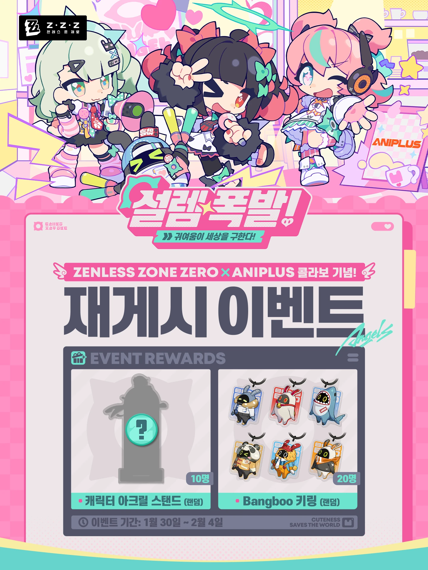 한편, 애니플러스는 콜라보 카페 개최를 기념해 공식 X(구 트위터)에서 ‘재게시(리트윗) 이벤트’를 진행한다. 1월 30일부터 2월 4일까지 진행되는 이번 이벤트는 관련 게시물을 재게시(RT)하면 추첨을 통해 ▲캐릭터 아크릴 스탠드(10명) ▲Bangboo 키링(20명)을 경품으로 증정한다.(