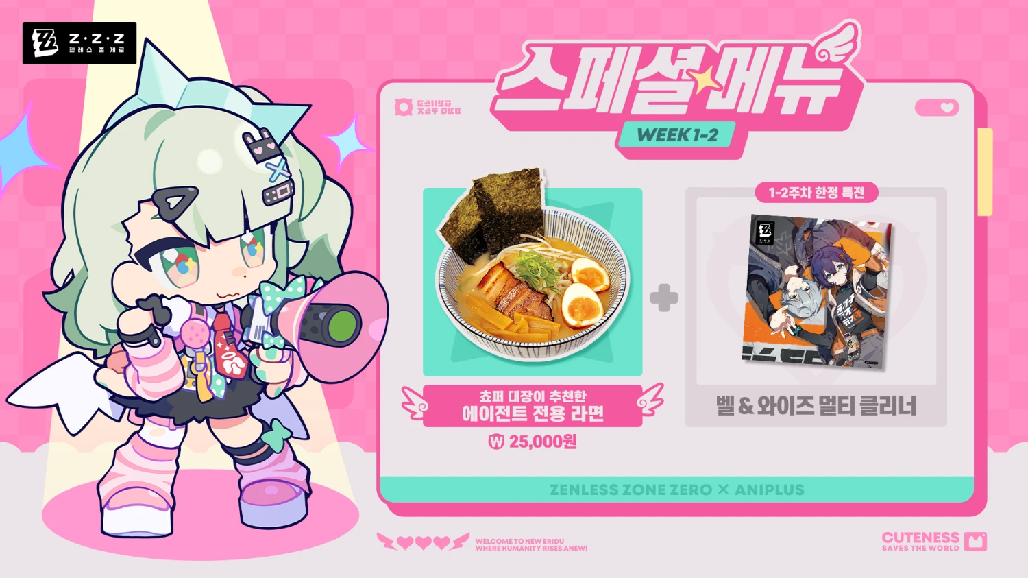 2주마다 변경되는 특별 한정 메뉴도 눈길을 끈다. ‘쵸퍼 대장이 추천한 에이전트 전용 라면(25,000원)’은 수량 한정으로 판매되며, 1~2주 차 기간 내 해당 메뉴 주문 시 ‘벨 & 와이즈 멀티 클리너’를 추가로 증정한다.