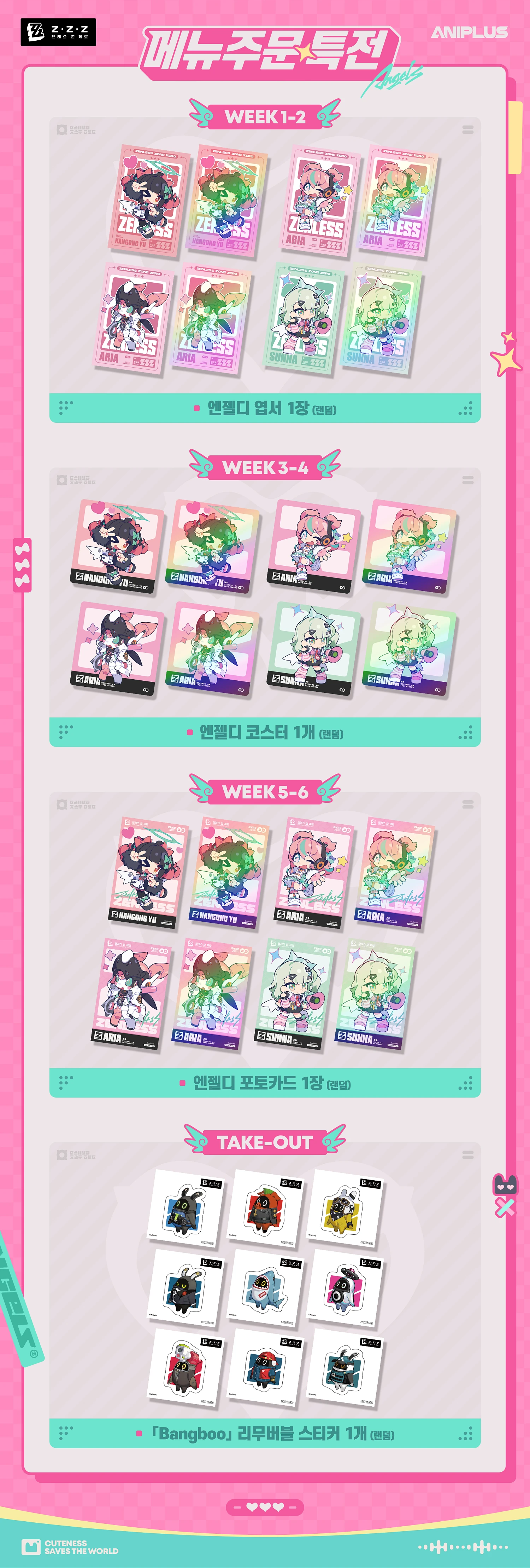 방문객을 위한 다양한 특전도 마련됐다. 음료와 디저트 주문 시 주차별로 엔젤디 엽서, 코스터, 포토카드 등을 랜덤 증정하며, 테이크아웃 고객에게는 ‘Bangboo(방부) 리무버블 스티커’를 제공한다. 또한 굿즈 구매 금액에 따라 캐릭터 리무버블 스티커(2만 원 이상), 역대 버전 키비주얼 포스트 카드(5만 원 이상)를 선물한다. 현장에서는 아크릴 스탠드, 캔뱃지, 장패드 등 다양한 ‘엔젤디’ 굿즈를 만나볼 수 있다.