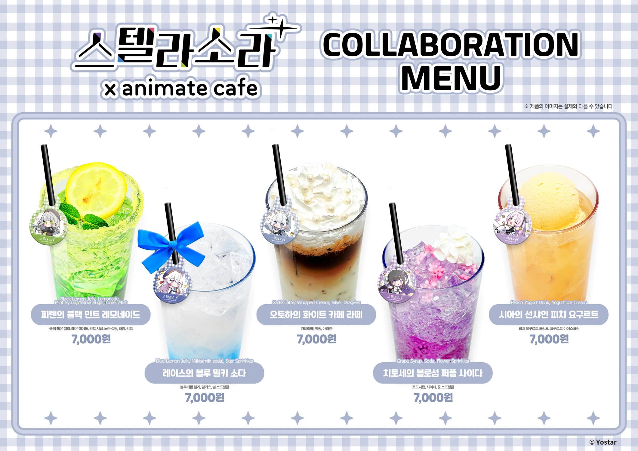 팬들의 미각을 충족시킬 캐릭터 테마 음료도 준비되었다. 피렌의 블랙 민트 레모네이드, 레이스의 블루 밀키 소다, 오토하의 화이트 카페 라떼, 치토세의 블라썸 퍼플 사이다, 시아의 선샤인 피치 요구르트 등 각 캐릭터의 메인 컬러와 콘셉트를 반영한 5종의 음료가 제공된다. 메뉴 주문 시 총 10종의 특전 코스터 중 1종을 랜덤으로 받을 수 있으며, 7,500원을 추가하면 유상 특전인 아크릴 코스터를 구매할 수 있다.