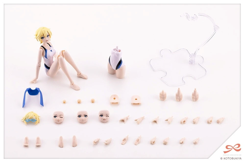 【교체용 바디 파츠】 서 있는 포즈용 상반신 파츠 외에, 「체육 앉기용 바디」가 부속됩니다. 풀사이드에서 휴식하고 있는 모습 등 폭넓은 시추에이션에 사용 가능. 목 파츠는 「일반 타입」 외에 목을 「뒤로 젖힌 타입」이 부속되어 있어, 교체를 통해 표현의 폭이 넓어집니다. 서 있는 상태에서 뒤로 젖힌 목을 사용하면 엎드린 자세로 만들 수도 있습니다. 등 맨살 파츠는 2종 모두 전시용 베이스에 대응하는 3mm 조인트 구멍이 뚫려있는 타입과 외형을 중시하여 3mm 구멍이 뚫려있지 않은 타입 2종류가 부속되어 있어 조립 시 취향에 맞는 사양을 선택하실 수 있습니다.