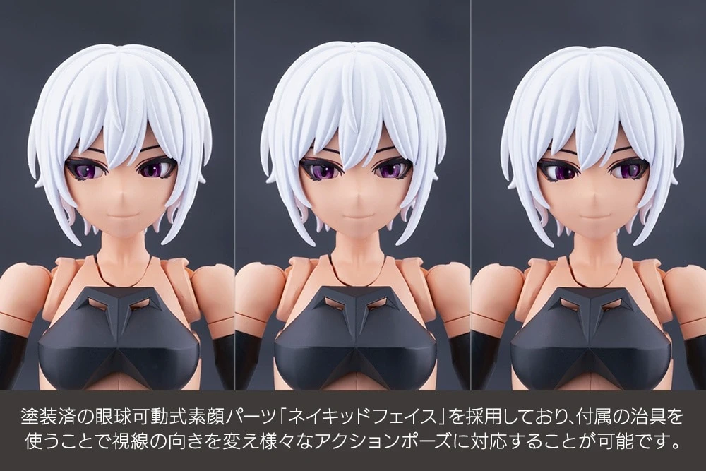 네이키드 페이스는 여성형 어나더의 마스크나 창채소녀정원의 표정 파츠와 호환성이 있습니다. 또한, 앞머 파츠는 여성형 어나더의 바이저 파츠나 일부 창채소녀정원 캐릭터의 앞머리 파츠와 호환성이 있어 맨몸과 메카를 조합한 커스터마이즈가 가능. 목의 볼 조인트는 5mm 직경으로 되어 있어 타 시리즈와 조합할 수 있는 것 외에, 6mm 직경 볼 조인트를 사용하는 것으로 메가미 디바이스의 머리를 부착하는 것이 가능합니다.